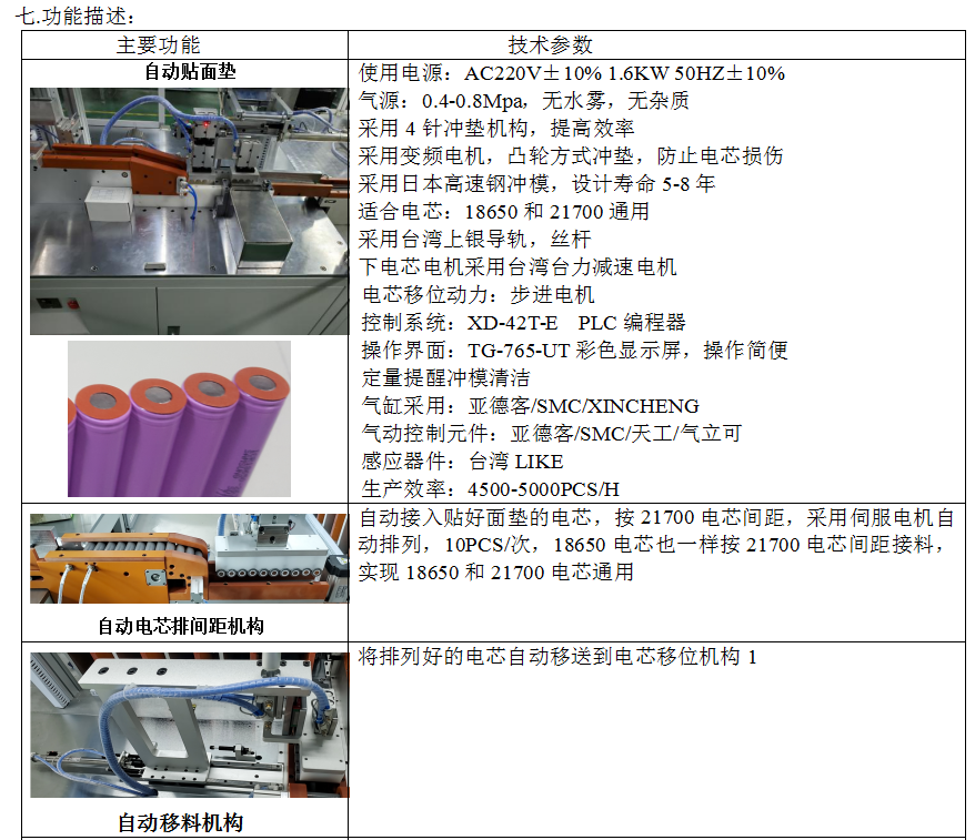 五.機(jī)器工作流程:人工將電芯放入面墊機(jī)料斗→正極自動貼圓形青稞紙(可關(guān)閉此功能)→自動分選電壓內(nèi)阻(已預(yù)留掃碼位置,后續(xù)可增加此功能)→按電壓內(nèi)阻自動分檔位→升降儲存窗儲存電芯→取同一檔位的電芯裝入相應(yīng)的膠盒→提供升降機(jī)自動將裝好電芯的膠盒傳送到人工入支架位置→自動CCD檢測正負(fù)極→人工鎳片入模具→自動點焊→電池組性能測試機(jī)(可選)